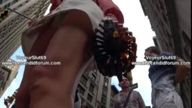 Red short skirt-clad teen in walking down the street with her friend. A voyeur lover walks behind her and video records her panty flash.